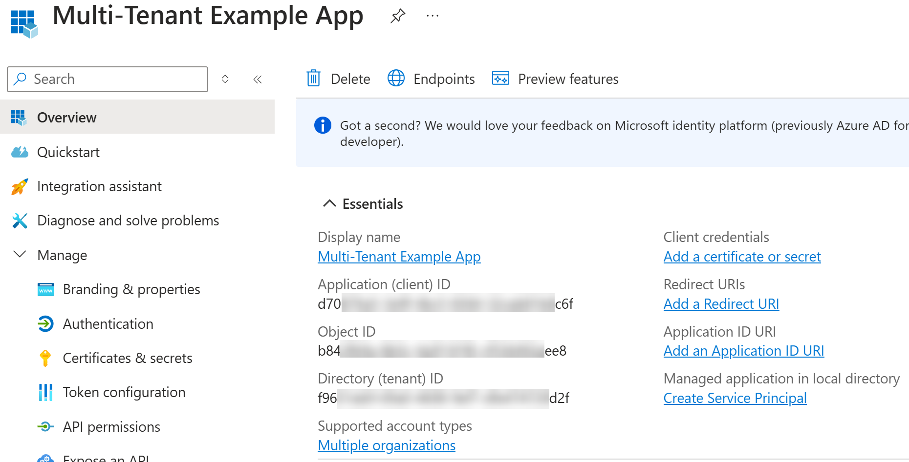 If you paid attention in the above app registration view, then you noticed that we didn’t create service principal into our home tenant since we don’t plan use it for e.g., granting access. Here is an another Multi-Tenant Example App 2 application which has a service principal created and that can be used in role assignments: